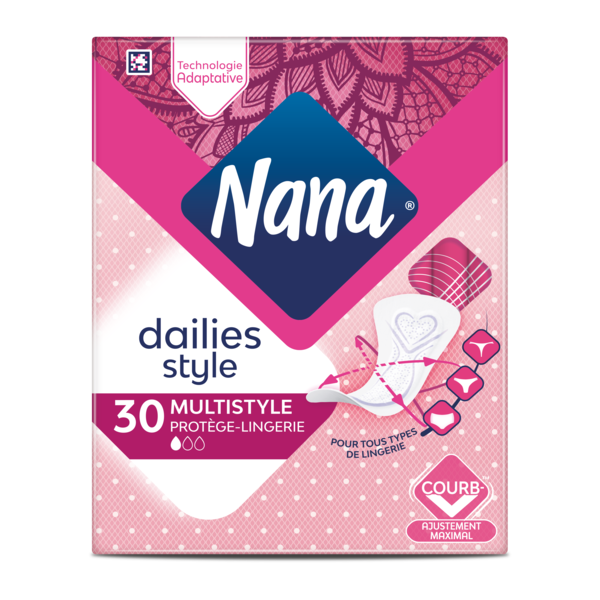 Les protège-lingeries Multistyle de Nana sont la solution idéale pour porter votre lingerie préférée. Grâce à ses côtés souples, le protège-slip est conçu pour s'adapter à tous types de sous-vêtements. Son cœur absorbant conçu pour absorber tout type de pertes, vous assure une protection quotidienne pour un sentiment de sécurité. Avec la technologie Curvefit , le protège-lingerie s'adapte également à vos courbes, pour encore plus de confort.