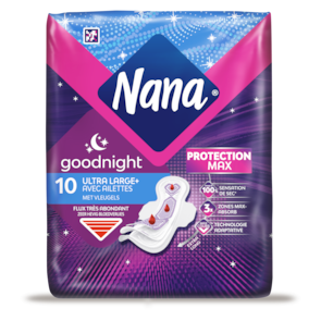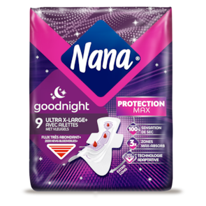 - Les serviettes hygiéniques Nana Maxi Night+ avec ailettes sont dotées d'un système de TRIPLE PROTECTION procurant une sensation de fraîcheur et de sec tout au long de la nuit.