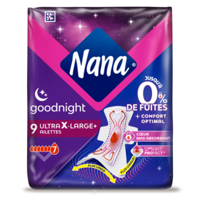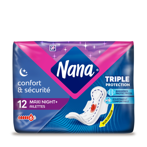 Les serviettes Nana Maxi Nuit permettent une triple protection: plus de sécurité, plus de confort et une absorption rapide pour une protection renforcée.